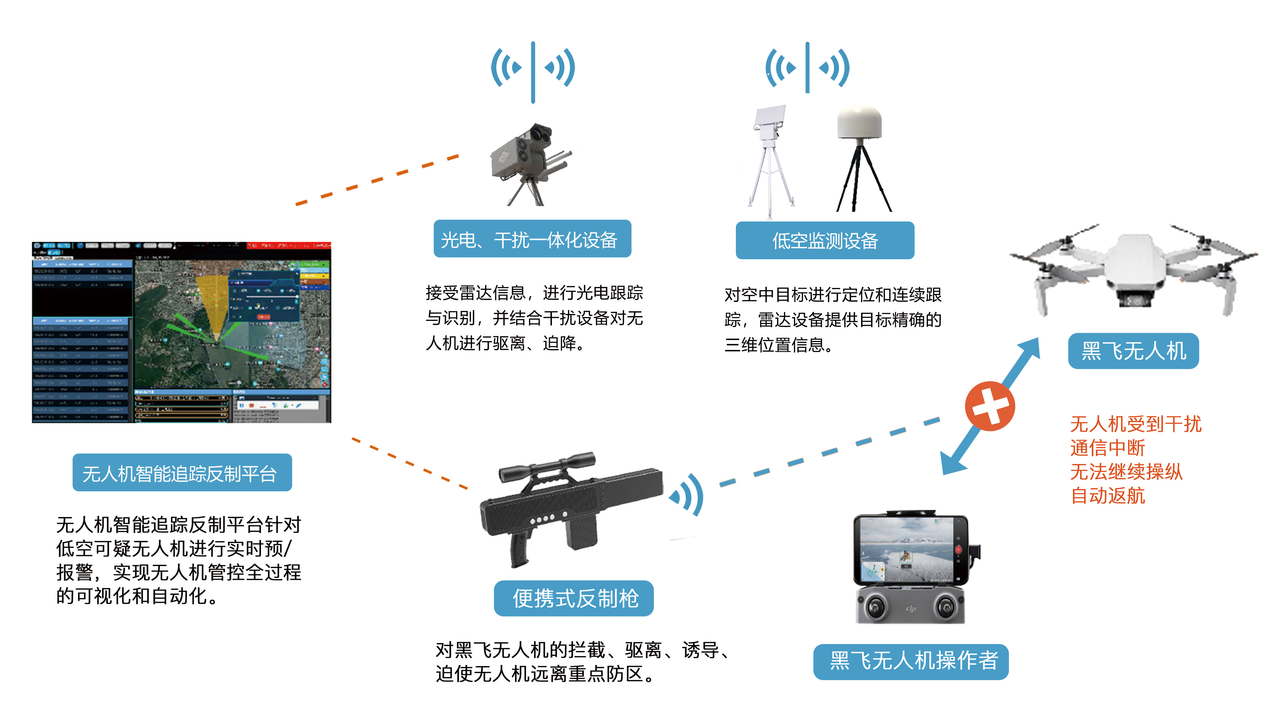 系統(tǒng)由雷達設(shè)備(主動式)、 “無線電監(jiān)測設(shè)備(被動式)、光電設(shè)備、干擾設(shè)備(定向式、全向式和便攜式)等部分組成。